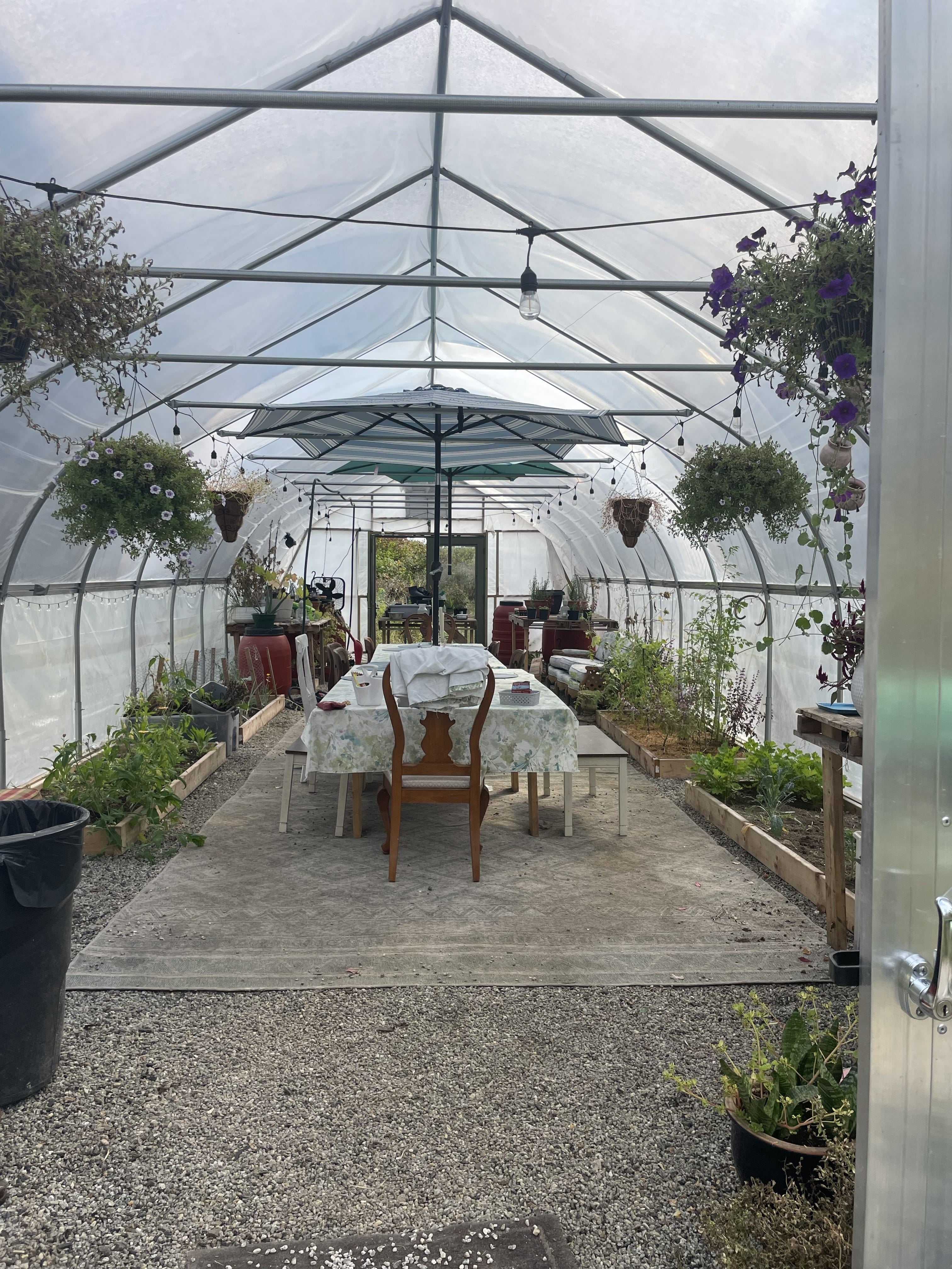 The creation just soothed something. I personally don’t have a library of what these flowers mean available in my mind. I’d have to look it up. But I can FEEL it. And that was Nicole’s message to me. My ability to sense and feel into the offerings of plants and flowers is something I hadn’t quite focused on with my conscious awareness. To be honest, I still am not so sure that I do. I think a lot of my time with plants is subconscious. I have dried plants, living plants, a 40’ greenhouse that sometimes gets attention and sometimes not. And yet, they always come back with some sort of message or nudge. The notions come in and I get to work. And that’s the whole point for me. When I’ve got a notion, I follow it to where it feels aligned. And aligned feels like a good place to be. Just like the greenhouse. Here’s a peak inside during a greener season than March for your viewing pleasure.