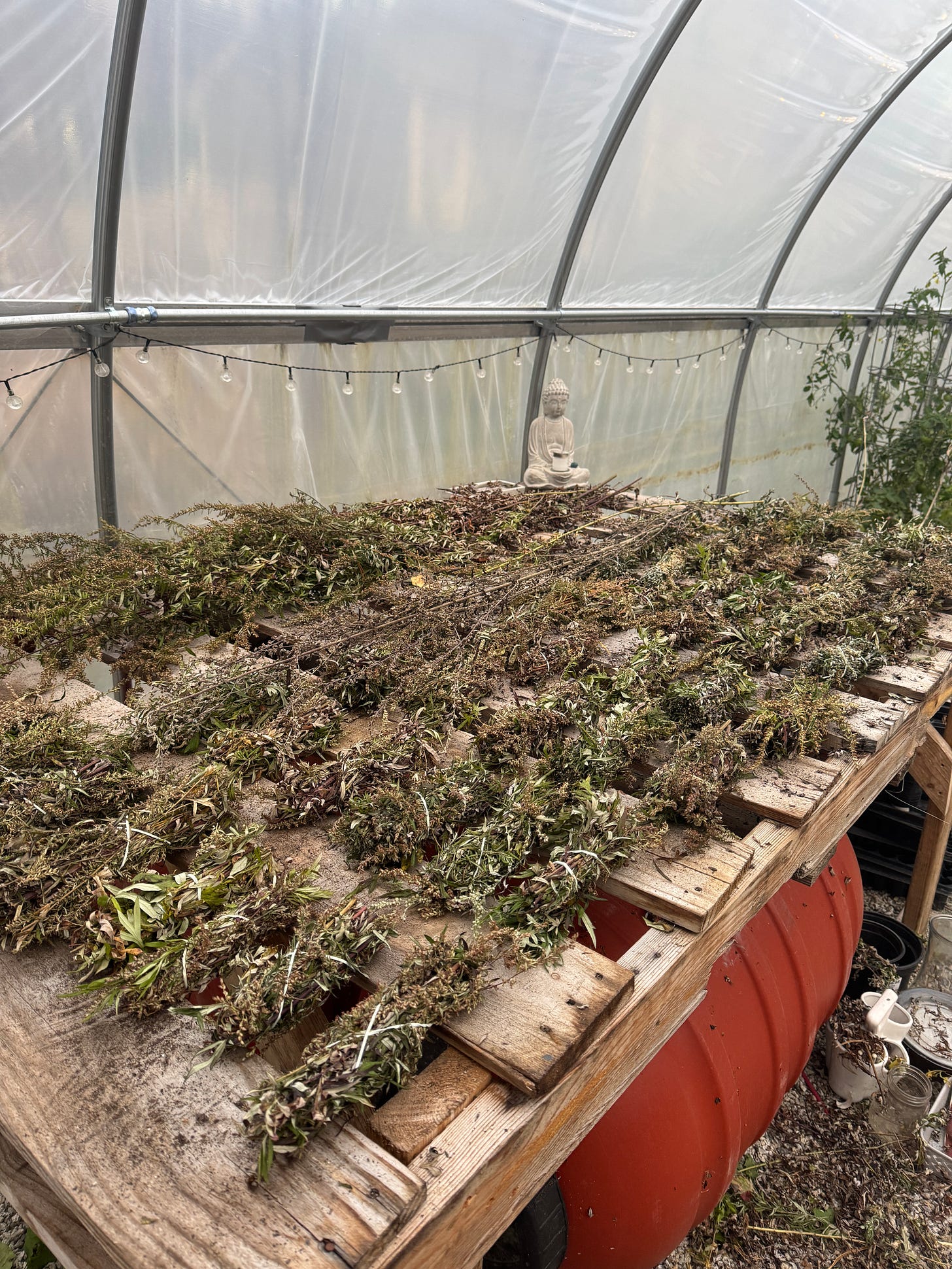 “What’s it all for anyway?” is the question I was asked by so many people during the gathering. I ended up filling the back of the truck bed with mugwort stalks as tall as me, sometimes taller in one afternoon. The first time someone asked I laughed, and I’m still smiling as I write. I think the answer was something along the lines of, “I feel like it, or I feel called to.” The conversation usually landed on asking what I was going to do with it. Very good question. I honestly had only thought of making smudge sticks out of them. So that was the answer. No need to make it more complicated than that really. The heaping pile of stalks lay on a pallet table in the greenhouse for a long time. I’d rotate them as they dried and move them around so the middle didn’t mold. It was later in the season and the greenhouse was not very humid so this idea worked out really well. At some point I realized the seemingly insane bulk I ended up with and how little of it was actually needed to make a smudge stick.